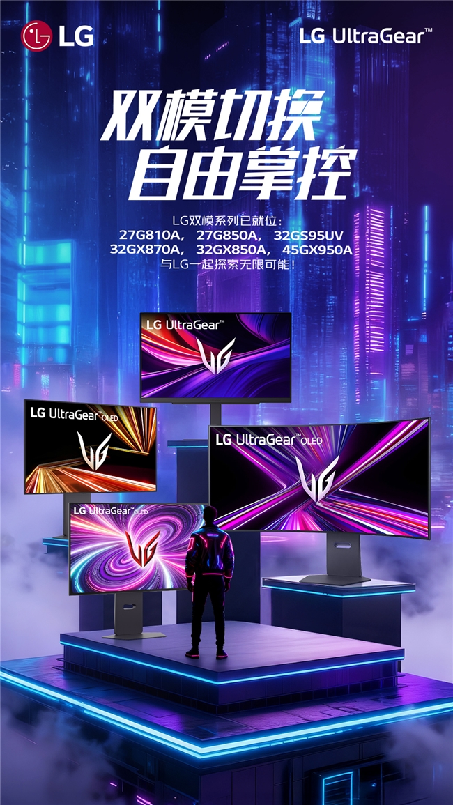LG UltraGear“双模全家桶”构建了覆盖多元需求的产品体系,涵盖27G810A、32GX870A、45GX950A等人气款双模产品,还有27G850A、32GS95UV、32GX850A等多款双模机型,精准匹配满足不同玩家的使用偏好与场景需求。该系列的核心竞争力在于双模一键切换功能,通过个性化参数定制,实现一屏适配多场景无缝转换。无论是沉浸体验3A大作时所需的超清画质渲染,还是驰骋FPS游戏时追求的极速响应表现,都能一键切换到位,助力玩家轻松达成“双模自由、视野自由、桌面自由”。在尺寸选择上,从27英寸主流尺寸、32英寸黄金尺寸,到适合追求更大显示范围的45英寸,全方位满足不同用户和场景需求,通过简洁时尚的外观设计,打造桌面空间美学,构建起覆盖广、适配强的电竞显示生态。